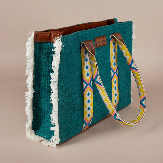 Teal Lenora Fringe Tote Bag with laptop compartment